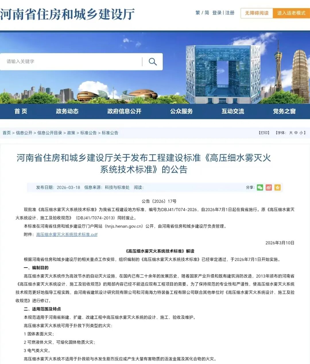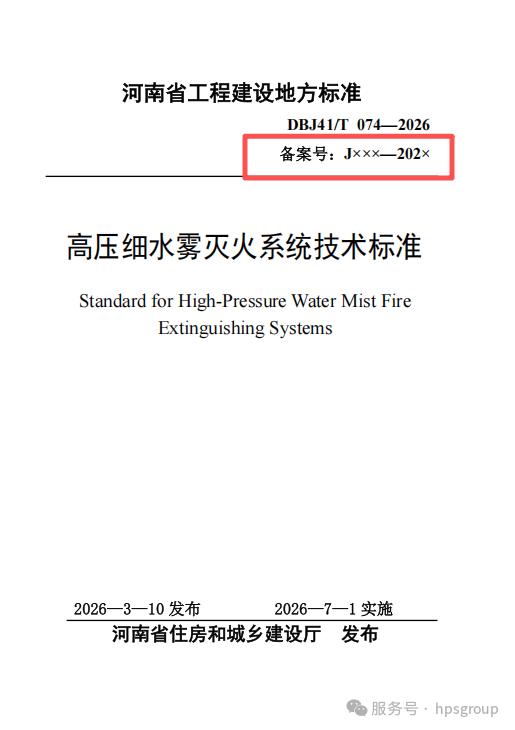 2026 年 3月 18 日,由海力特公司主编修订的河南省工程建设标准DBJ41/T 074-2026《高压细水雾灭火系统技术标准》正式获批,并将于2026年7月1日正式实施。