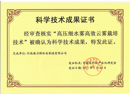 海力特云雾培-智能植物工厂技术于2017年1月通过科技成果鉴定,为国际首创!该成果拥有自主知识产权,整体技术达到国际先进水平,其中营养液高压雾化技术达到国际领先水平。